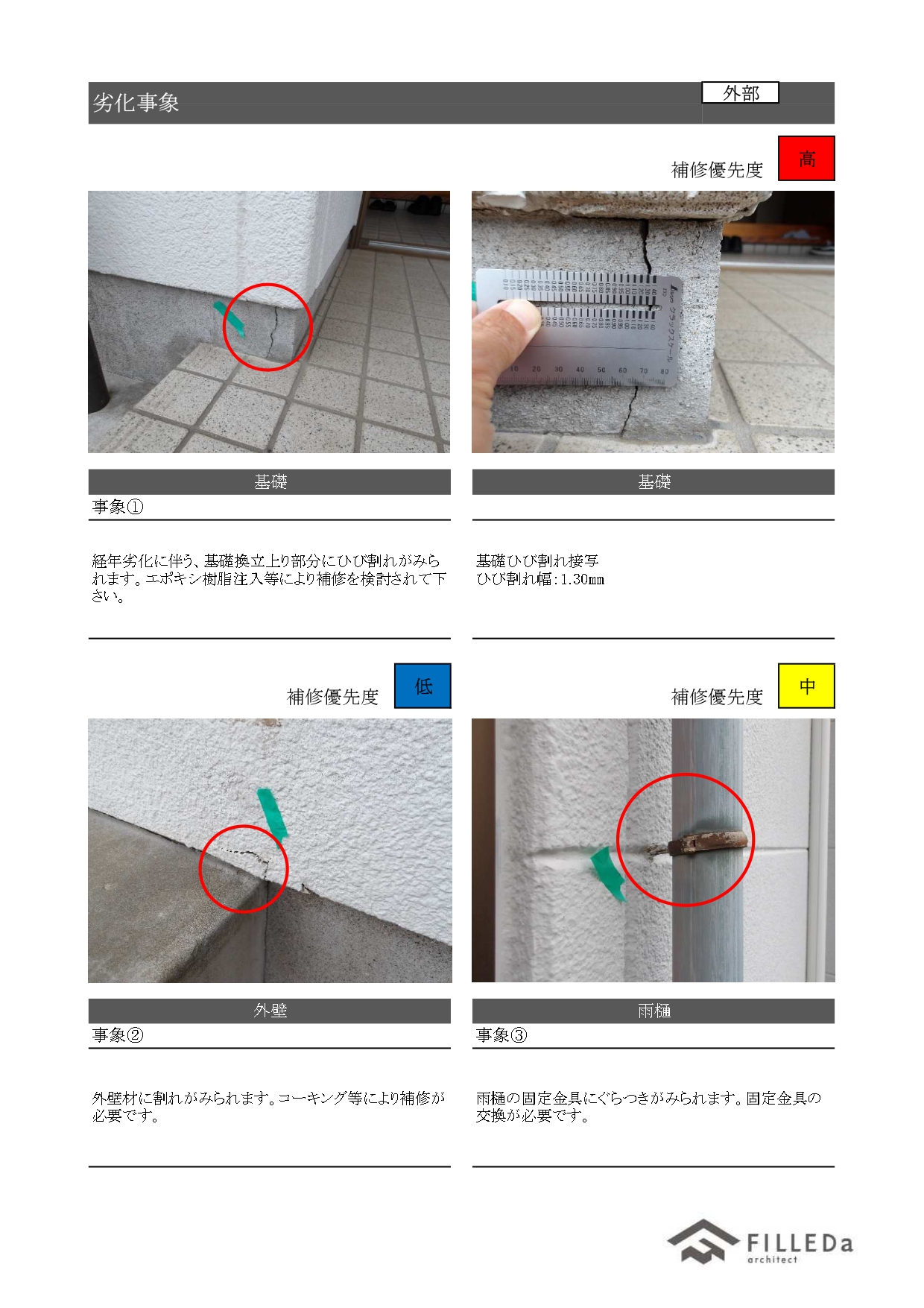 これにより「どこに問題があるのか」が一目で分かるだけでなく、修繕の優先度を明示しているため、専門知識がなくても「まず直すべき箇所」と「将来的に対応すればよい箇所」が判断しやすくなります。